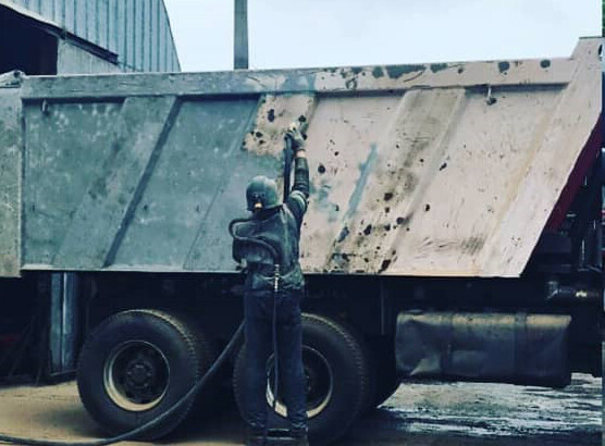 Вид работы: пескоструйная обработка грузовика от старой краски и следов коррозии, безвоздушная покраска